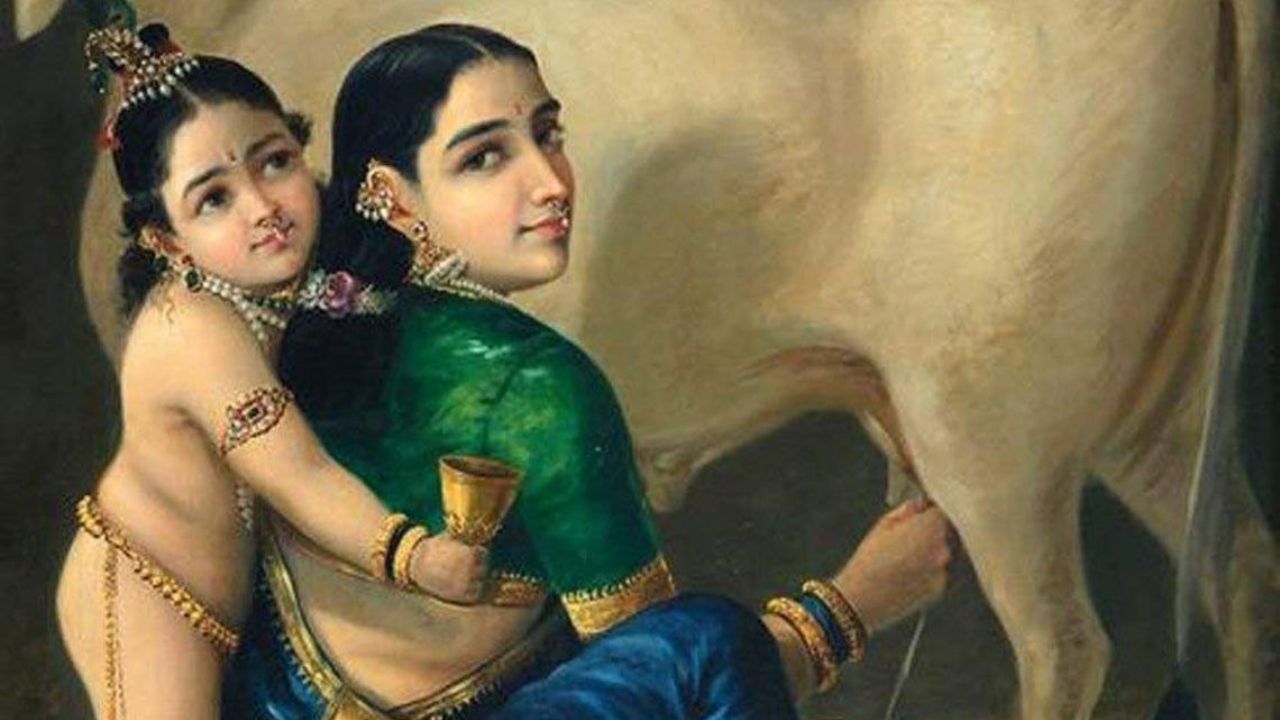 यह पेंटिंग 1890 के दशक में बनाई गई थी, जब राजा रवि वर्मा अपनी आर्ट करियर के पीक पर थे. इस पेंटिंग में भगवान कृष्ण के बचपन का एक बहुत प्यारा और कोमल दृश्य दिखाया गया है. माता यशोदा अपने लाडले बाल कृष्ण को गोद में लिए हुए हैं. इस पेंटिंग के जरिए कलाकार ने मातृत्व के प्यार को बहुत गहराई और कोमलता के साथ दर्शाया है. यशोदा और कृष्ण के बीच का ममता भरा रिश्ता देखकर कोई भी मां-बेटे के प्यार को महसूस कर सकता है.