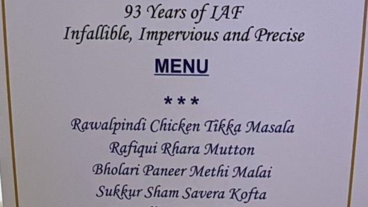 IAF ने इस बार अपने 93वें स्थापना दिवस पर जो डिनर मेन्यू पेश किया, उसने सोशल मीडिया पर तहलका मचा दिया. रावलपिंडी चिकन टिक्का मसाला जैसे नामों से सजे इस मेन्यू ने फनी तरीके से पाकिस्तान को तगड़ा झटका दिया.