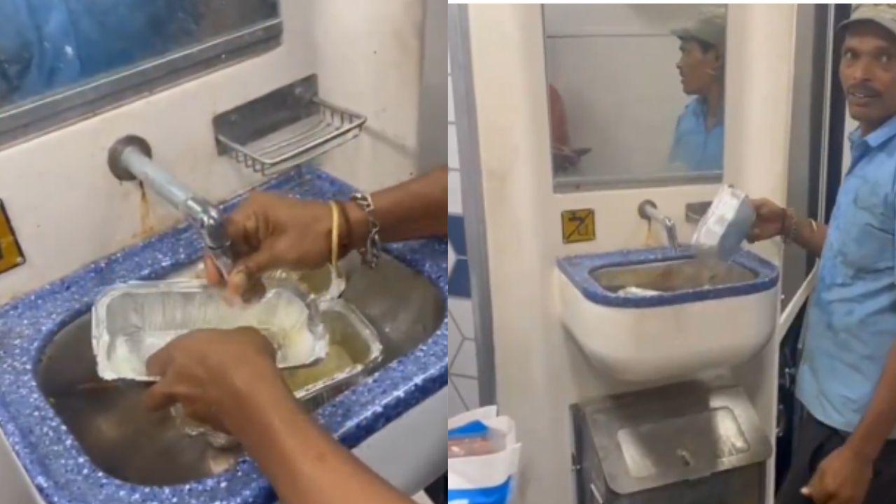 यह वीडियो एक्स पर वायरल हो रहा, जिसमें एक शख्स जो कथित तौर पर रेलवे कैंटीन स्टाफ का कर्मचारी बताया जा रहा है, ट्रेन के पैसेंजर कोच में बने वॉशबेसिन पर प्लास्टिक फूड ट्रे धोता नजर आता है. वह इस्तेमाल किए गए कंटेनर पर पानी डालकर उन्हें साफ करता है और फिर बड़ी सफाई से उन्हें ढेर में लगाता जाता है, जैसे दोबारा इस्तेमाल के लिए तैयार कर रहा हो.