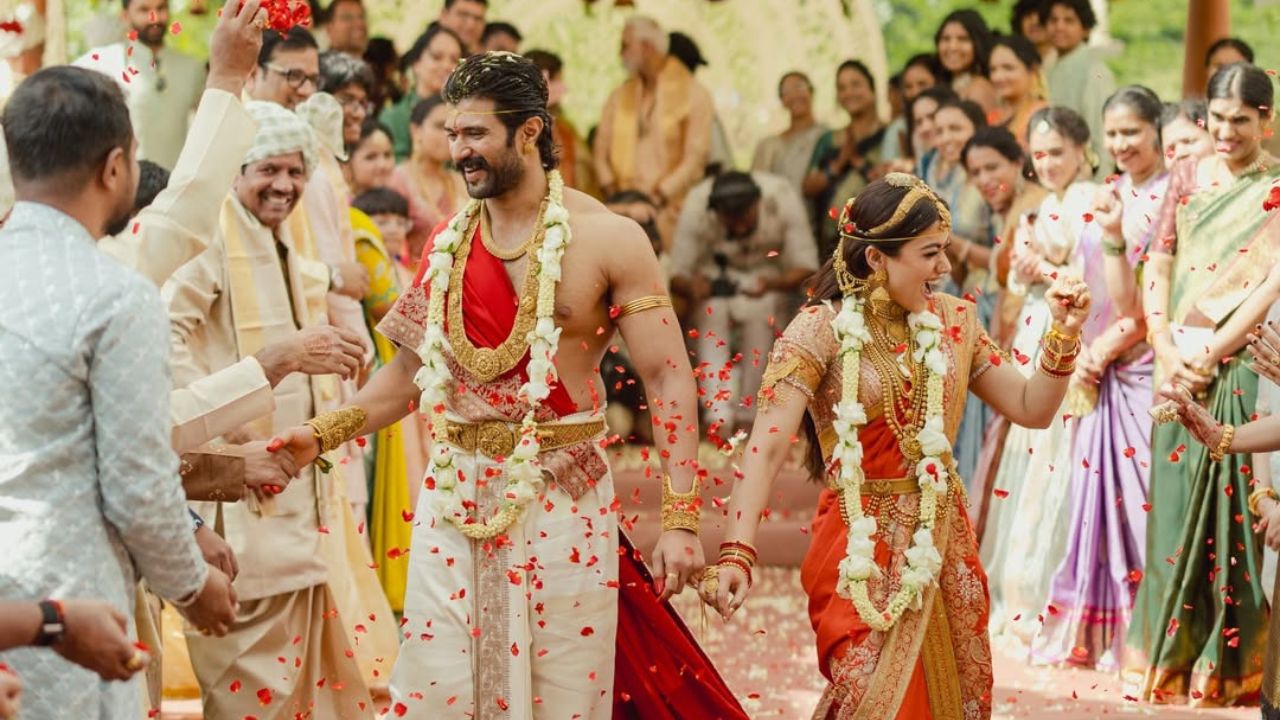 विजय भी कम नहीं थे. उन्होंने अनामिका खन्ना का ही आउटफिट पहना. हाथीदांत (ऑफ-व्हाइट/आइवरी) रंग की धोती और सिंदूरी (लाल-केसरिया) अंगवस्त्रम. अंगवस्त्रम पर जंगल और मंदिर से इंस्पायर्ड बारीक कढ़ाई थी. जो ताकत, परिवार की परंपरा और पवित्र आर्किटेक्चर को दिखाती थी. ये लुक हैदराबाद की पुरानी टेक्सटाइल ट्रेडिशन और वनसिंघाराम वीव की मजबूती को सेलिब्रेट करता था. विजय के हाथों पर आलता लगी हुई थी, जो पारंपरिक टच दे रही थी. उनका पूरा लुक देक्कन मर्दानगी को दिखाता था सिंपल लेकिन पावरफुल.