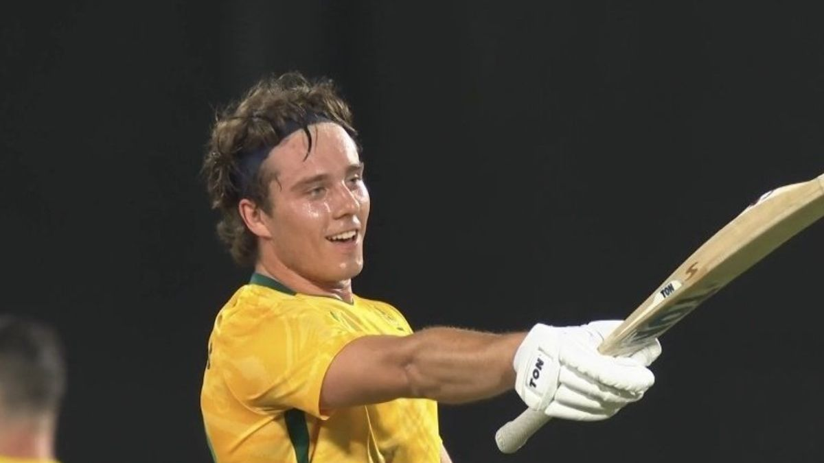 CSK के प्लेयर डेवाल्ड ब्रेविस ने इतिहास रच दिया है. उन्होंने ऑस्ट्रेलिया के खिलाफ दूसरे टी-20 इंटरनेशनल में नाबाद 125 रन बनाए. इस पारी के दौरान ब्रेविस ने ऑस्ट्रेलिया में वह कारनामा कर दिखाया, जो आज तक कोई नहीं कर पाया. उनकी पारी की बदौलत साउथ अफ्रीका 7 विकेट के नुकसान पर 218 रन बनाने में कामयाब रही.;
