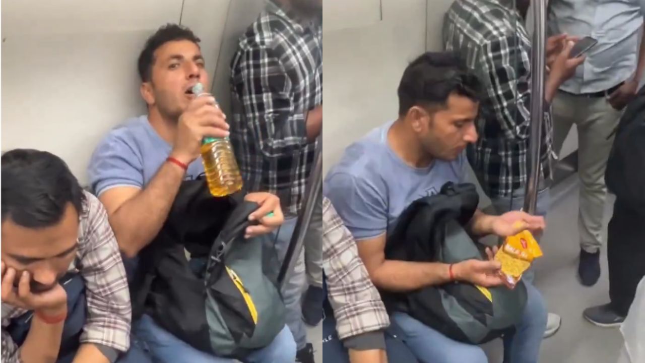 दिल्ली मेट्रो से जुड़ा एक हैरान करने वाला वीडियो सोशल मीडिया पर तेजी से वायरल हो रहा है. इसमें एक शख्स मेट्रो के अंदर बैग से बोतल निकालकर शराब पीता नजर आ रहा है. हैरानी की बात यह है कि शराब के साथ वह आराम से चखना खाते हुए भी दिखाई देता है.