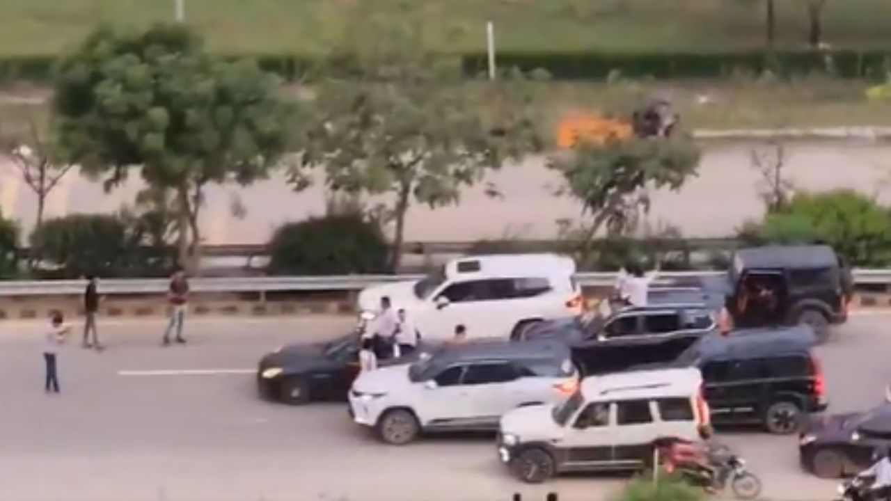 मर्सिडीज-बेंज एसएलसी कन्वर्टिबल, एस्टन मार्टिन, टोयोटा फॉर्च्यूनर, महिंद्रा थार और कई हैचबैक सहित एक दर्जन से अधिक गाड़ियों ने ऊपरी द्वारका एक्सप्रेस वे पर शोभा सिटी सोसाइटी के पास रील बनाई, जिससे जाम लग गया.;