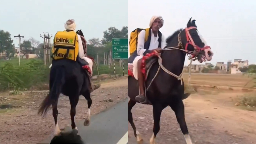 राजस्थान की राजधानी जयपुर से एक ऐसा वीडियो सामने आया है, जिसने लोगों को हैरान भी किया और मुस्कुराने पर भी मजबूर कर दिया. आमतौर पर जहां डिलीवरी बॉय साइकिल या बाइक पर नजर आते हैं, वहीं इस वीडियो में एक बुजुर्ग व्यक्ति घोड़े पर सवार होकर सामान डिलीवर करते दिख रहे हैं. उनके साथ एक और व्यक्ति भी मौजूद है और घोड़े के साथ पीले रंग का डिलीवरी बैग लटका हुआ है, जो Blinkit के डिलीवरी बैग जैसा दिखता है.