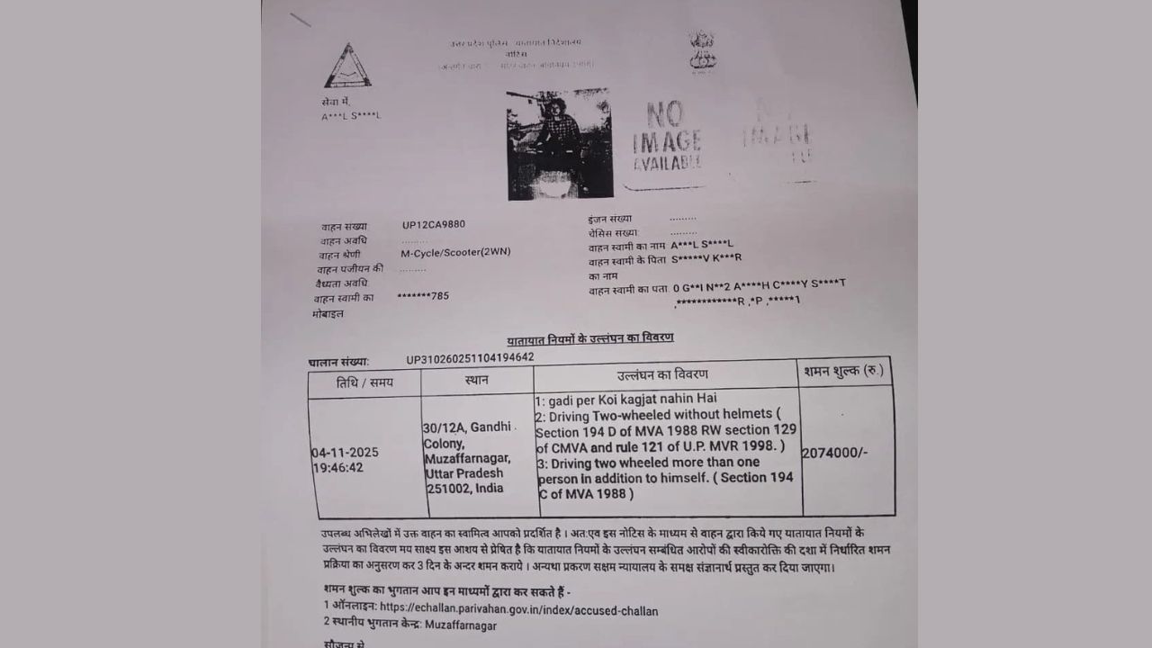 उत्तर प्रदेश के मुजफ्फरनगर में एक स्कूटी सवार को बिना हेलमेट चलाने पर ₹20.74 लाख का चालान थमा दिया गया. मामला सोशल मीडिया पर वायरल होते ही पुलिस ने गलती सुधारते हुए चालान ₹4,000 का कर दिया और सब-इंस्पेक्टर की चूक मानी.;