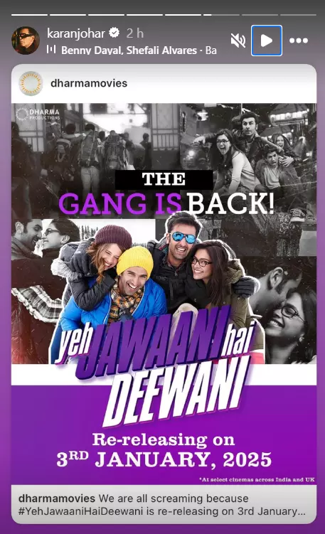 निर्माता करण जौहर ने 'ये जवानी है दीवानी' की दोबारा रिलीज पर अपनी एक्साइटमेंट शेयर किया और कहा, 'ये जवानी है दीवानी' (Yeh Jawaani Hai Deewani) धर्मा प्रोडक्शंस के दिल में एक खास जगह रखती है. फिल्म में शानदार म्यूजिक, शानदार लोकेशन, हमारे कुछ सबसे पसंदीदा कलाकार और एक ऐसी कहानी है जो सभी जनरेशन के बीच गूंजती है. नए साल की शुरुआत के लिए यह बिल्कुल सही फिल्म है. यह फिल्म आपको अपनी लाइफ के बारे में एक गर्मजोशी भरा, अस्पष्ट अहसास कराती है. हम यह देखने के लिए इंतजार नहीं कर सकते कि जेनजी इसे बड़े पर्दे पर एडल्ट्स के रूप में देखकर कैसा महसूस करता है.'