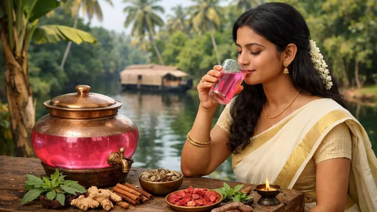 केरल में पीया जाने वाला गुलाबी रंग का पानी पथिमुघम लकड़ी से बनता है, जो पूरी तरह प्राकृतिक और आयुर्वेदिक है. यह पानी न सिर्फ शरीर को ठंडक देता है बल्कि कई स्वास्थ्य लाभ भी देता है.