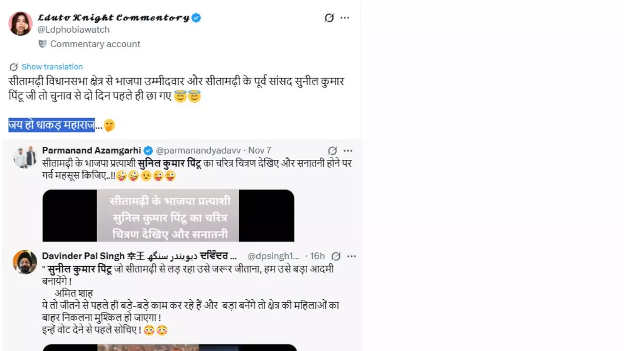 Davinder Pal Singh नाम के एक यूजर ने लिखा कि, सुनील कुमार पिंटू जो सीतामढ़ी से लड़ रहा उसे जरूर जीताना, हम उसे बड़ा आदमी बनायेंगे. अमित शाह. ये तो जीतने से पहले ही बड़े-बड़े काम कर रहे हैं और बड़ा बनेंगे तो क्षेत्र की महिलाओं का बाहर निकलना मुश्किल हो जाएगा! इन्हें वोट देने से पहले सोचिए!Karan Yadav नाम के एक यूजर ने लिखा कि, ये वही सुनील कुमार पिंटू भाजपा प्रत्याशी है जिसका अश्लील वीडियो वायरल हुआ है. गृह मंत्री जी कितना निर्लज्जता के साथ उसके लिए वोट मांग रहे है. अमित शाह जी के खास मित्र है. एक यूजर ने लिखा कि, सीतामढ़ी के भाजपा प्रत्याशी सुनिल कुमार पिंटू का चरित्र चित्रण देखिए और सनातनी होने पर गर्व महसूस किजिए..Parmanand Azamgarhi नाम के एक यूजर ने लिख कि देश के गृह मंत्री ने अपील की सुनील कुमार पिंटू को फिर से वोट दीजिए उनको बड़ा आदमी बनेंगे. और यह बड़ा आदमी बनकर महिलाओं का रेप करेंगे