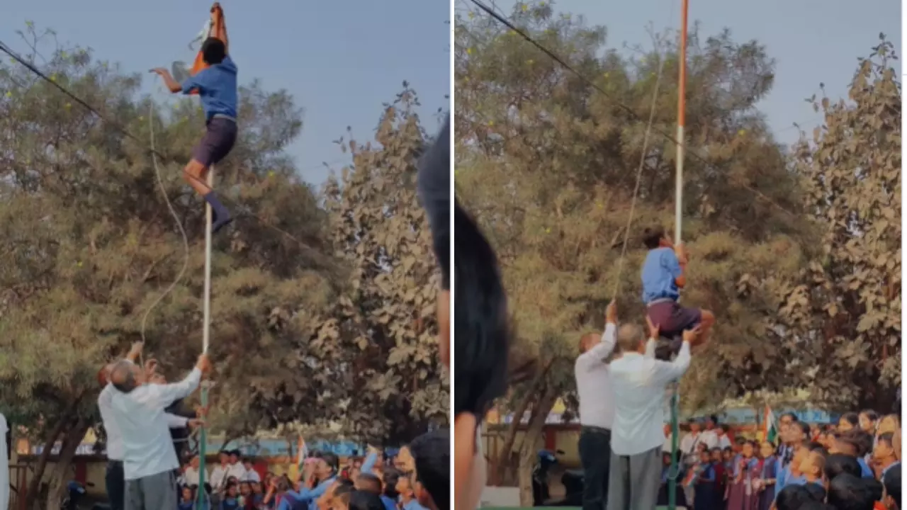 जब शिक्षक और आयोजन समिति समाधान खोज रही थी, तभी स्कूल का एक छात्र आगे आया. वीडियो में देखा जा सकता है कि वह फुर्ती से धातु के खंभे पर चढ़ा और हाथों से तिरंगे की गुत्थी सुलझा दी.