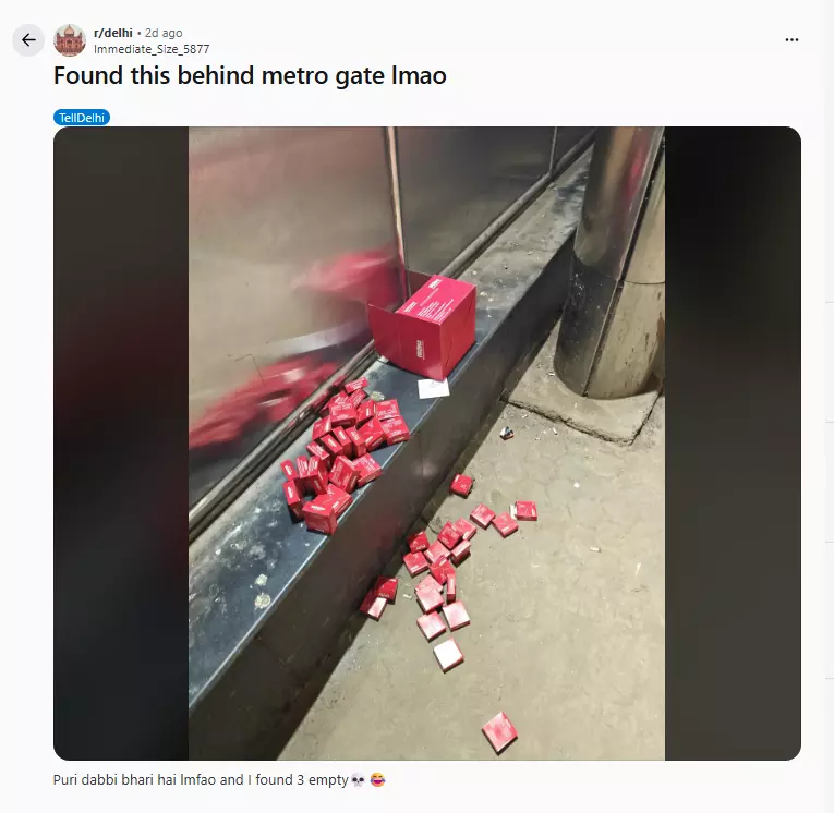हर रोज़ दिल्ली मेट्रो में यात्रा करने वाले लोग अक्सर कुछ सामान खोया हुआ पाते हैं. जैसे कि मोबाइल फोन, लैपटॉप (कभी-कभी), या फिर सोते हुए यात्रियों की चीजें। लेकिन एक बड़ा डिब्बा निरोध कंडोम का? यह तो सच में बहुत ही दुर्लभ और हैरान करने वाली बात है! दिल्ली मेट्रो में नियमित रूप से सफर करने वाले एक यात्री को उस दिन कुछ ऐसा अनएक्सपेक्टेड मिला, जो उन्होंने कभी सोचा भी नहीं होगा. स्टेशन के गेट के ठीक पीछे उन्हें कंडोम का एक बड़ा डिब्बा पड़ा हुआ दिखाई दिया. इस डिब्बे के साथ-साथ कंडोम के कई पैकेट भी बिखरे हुए थे. इस घटना की तस्वीर को एक व्यक्ति ने रेडिट पर शेयर किया, और देखते ही देखते यह पोस्ट पूरी तरह से वायरल हो गई.