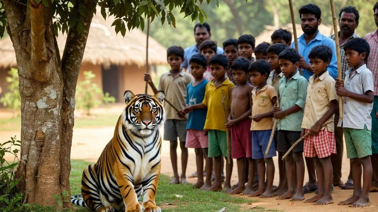 जंगल से भटक कर गांव पहुंचा बाघ, जान बचाने के लिए बच्चों और टीचर्स को डंडों का सहारा