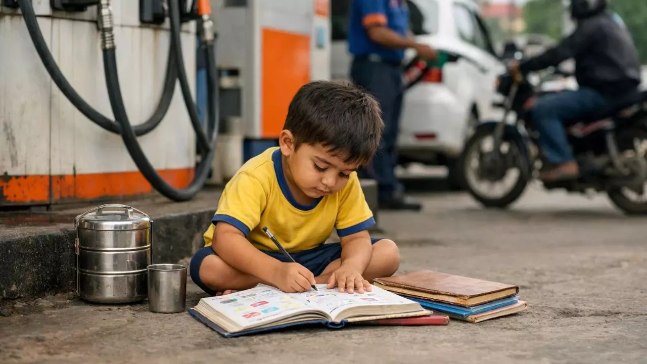 पेट्रोल पंप की लाइट में पढ़ता है बच्चा
