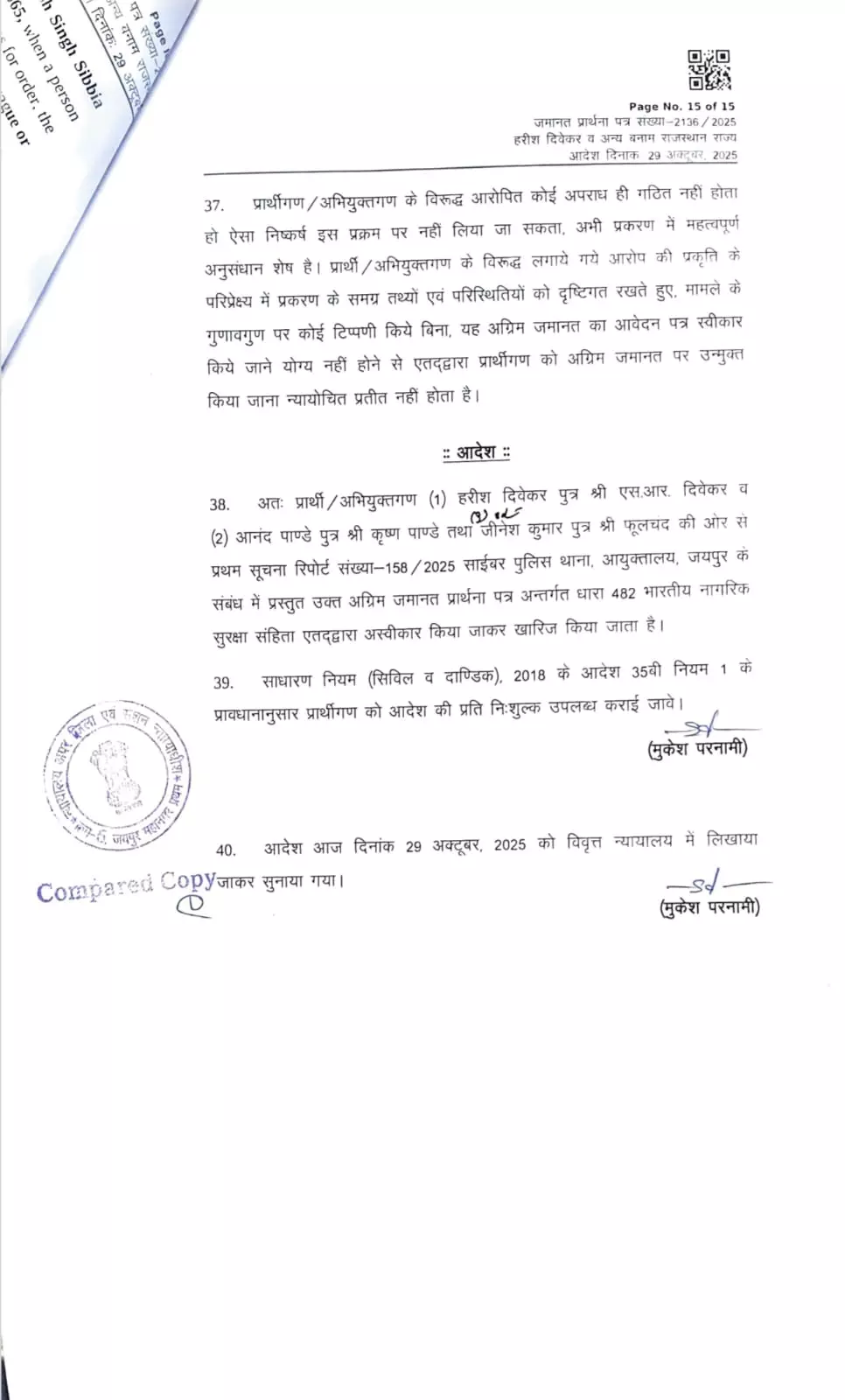 जयपुर सेशन कोर्ट ने अपने आदेश में कहा कि इस प्रकरण में आरोप इतने गंभीर हैं कि फिलहाल किसी आरोपी को राहत नहीं दी जा सकती. कोर्ट के रुख ने पुलिस को आरोपियों के खिलाफ सख्त कार्रवाई का संकेत दे दिया है.